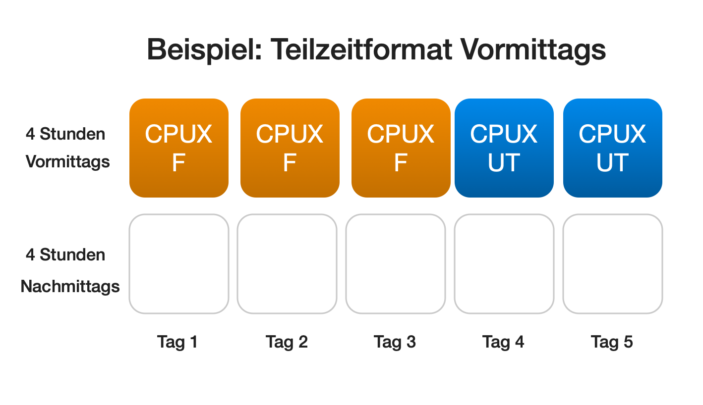 - 7 halbe Tage vormittags oder nachmittags mit fixen Terminen